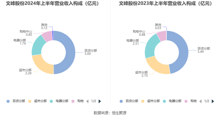 分产品来看,2024年上半年公司主营业务中,百货分部收入5.00亿元,同比下降8.86%,占营业收入的49.99%;超市分部收入2.28亿元,同比下降15.45%,占营业收入的22.80%;电器分部收入1.76亿元,同比下降29.65%,占营业收入的17.64%。