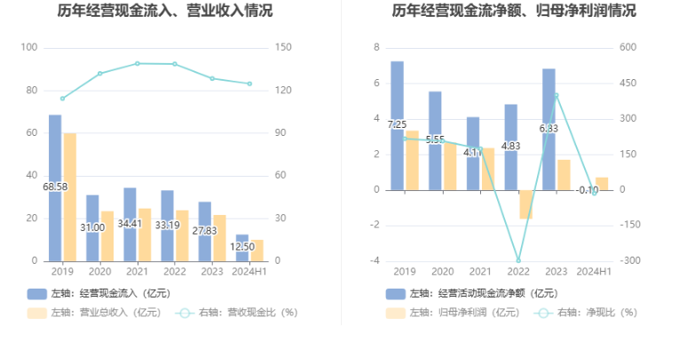 2024年上半年,公司营业收入现金比为124.91%,净现比为-13.79%。