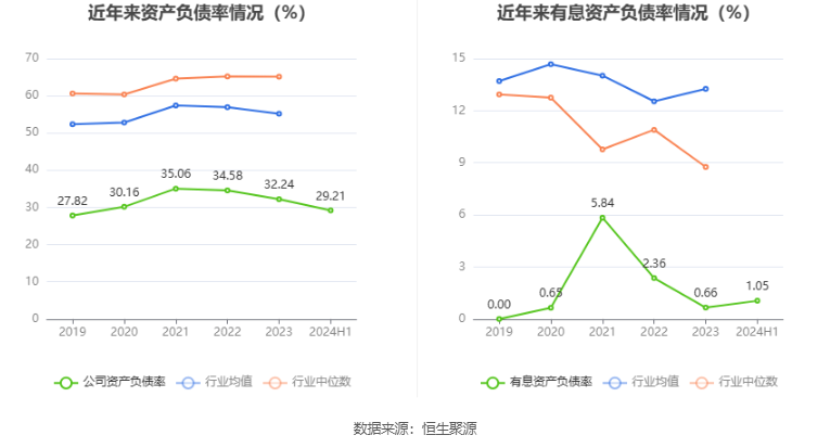 在偿债能力方面,公司2024年上半年末资产负债率为29.21%,相比上年末下降3.03个百分点;有息资产负债率为1.05%,相比上年末上升0.39个百分点。