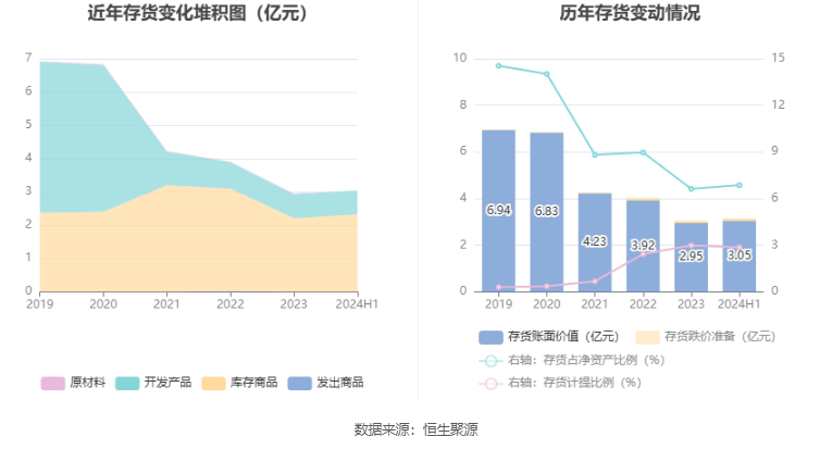 从存货变动来看,截至2024年上半年末,公司存货账面价值为3.05亿元,占净资产的6.87%,较上年末增加1065.32万元。其中,存货跌价准备为898.0万元,计提比例为2.86%。