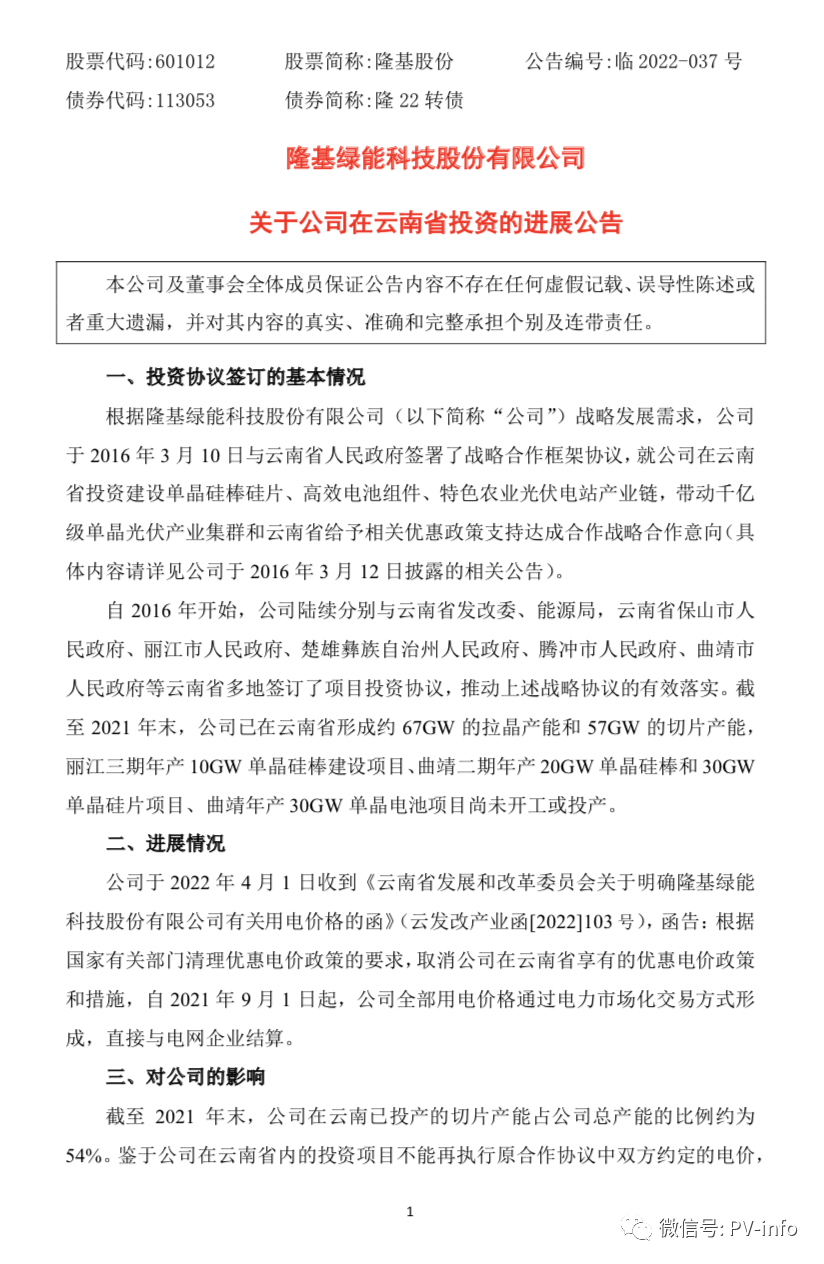 公司于2022年4月1日收到《云南省发展和改革委员会关于明确隆基绿能科技股份有限公司有关用电价格的函》(云发改产业函[2022]103号),函告:根据国家有关部门清理优惠电价政策的要求,取消公司在云南省享有的优惠电价政策和措施,自2021年9月1日起,公司全部用电价格通过电力市场化交易方式形成,直接与电网企业结算。三、对公司的影响