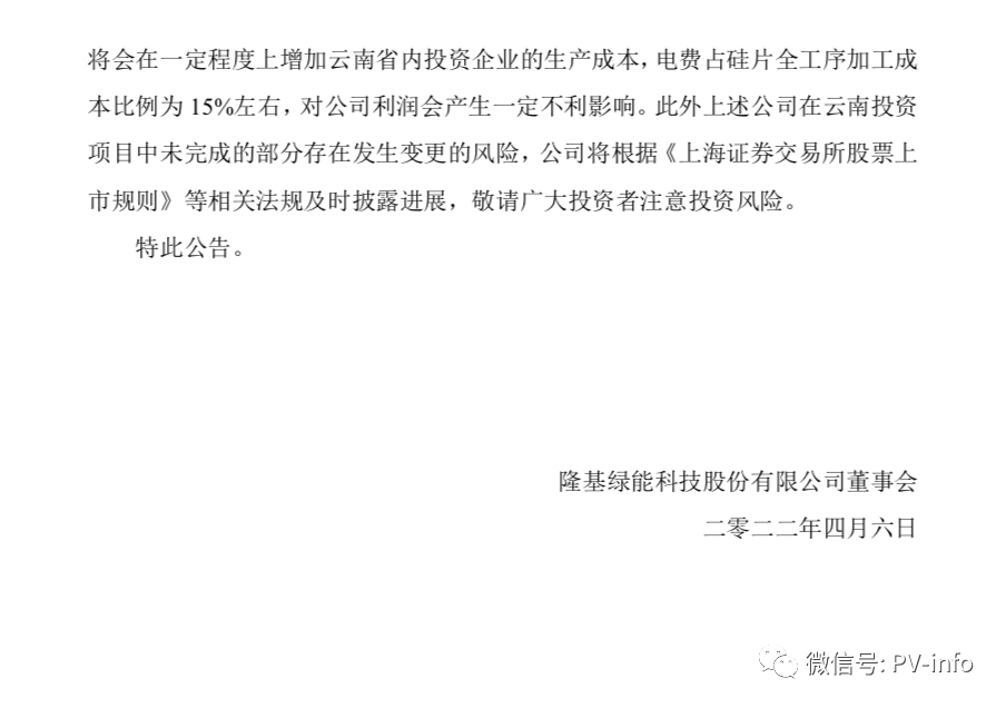 截至2021年末,公司在云南已投产的切片产能占公司总产能的比例约为54%。鉴于公司在云南省内的投资项目不能再执行原合作协议中双方约定的电价,将会在一定程度上增加云南省内投资企业的生产成本,电费占硅片全工序加工成本比例为15%左右,对公司利润会产生一定不利影响。此外上述公司在云南投资项目中未完成的部分存在发生变更的风险,公司将根据《上海证券交易所股票上市规则》等相关法规及时披露进展,敬请广大投资者注意投资风险。
