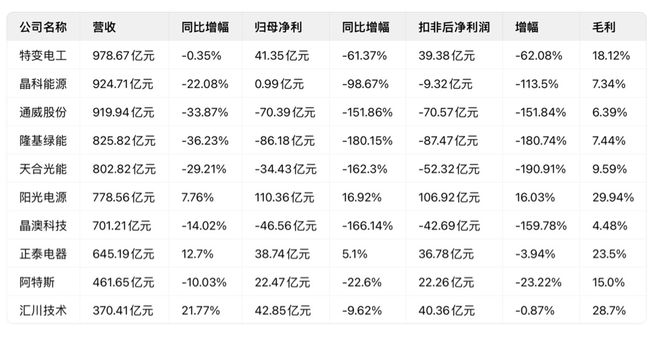 部分光伏上市公司2024年业绩表现,南都湾财社记者制图