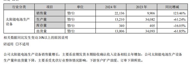 但是,在光伏调整周期下,“光伏卖铲人”也面临一定的挑战。比如捷佳创伟2024年产量、出货量均同比下滑超60%,公司在年报中表示:公司太阳能电池生产设备销售量增长,主要系前期发货本期验收确认收入设备相较去年增加;公司太阳能电池生产设备生产量和出货量下降,主要系受光伏行业整体情况影响,下游客户扩产放缓、订单下降所致。