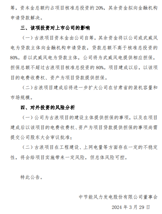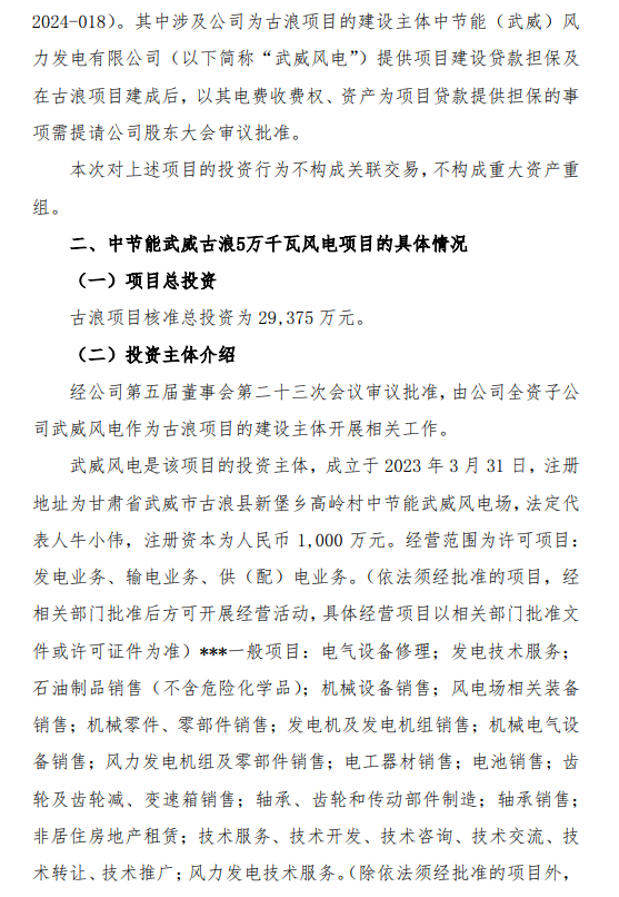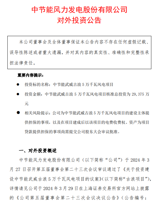 根据公告,节能风电于2024年3月27日召开第五届董事会第二十三次会议审议通过了《关于投资建设中节能武威古浪5万千瓦风电项目的议案》。其中涉及公司为古浪项目的建设主体中节能(武威)风力发电有限公司(简称:武威风电)提供项目建设贷款担保及在古浪项目建成后,以其电费收费权、资产为项目贷款提供担保的事项需提请公司股东大会审议批准。