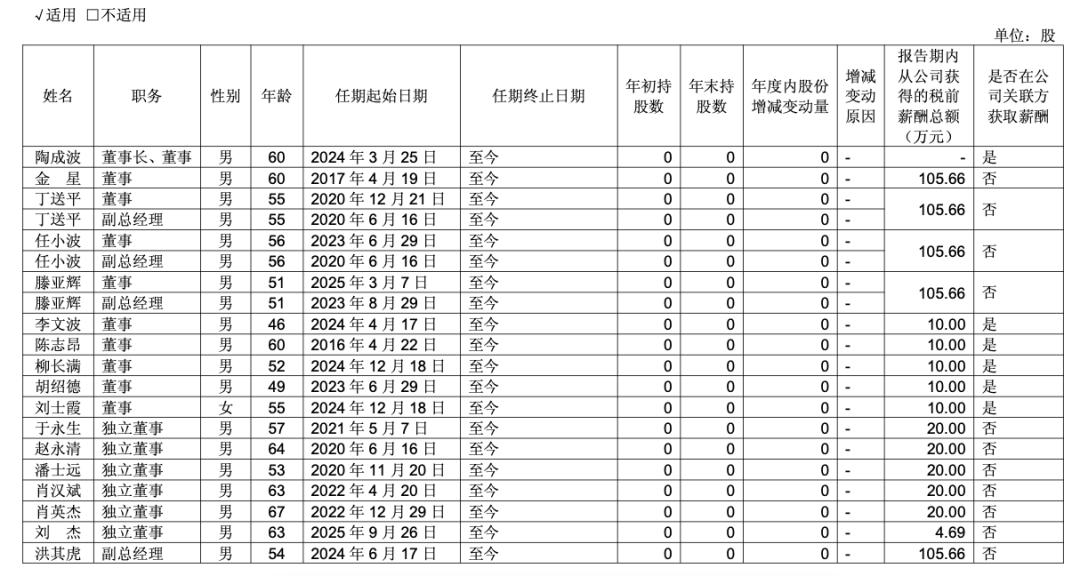2025年年报显示,公司董事、监事和高级管理人员2025年报酬总额900.27万元,比2024年的1,063.19万元减少162.92万元,同比下降15.32%。董事长、董事陶成波2025年从公司获得的税前报酬总额为0,在公司关联方获取报酬。董事、副总经理丁送平2025年从公司获得的税前报酬总额为105.66万元,未在公司关联方获取报酬。董事会秘书蒋伟2025年从公司获得的税前报酬总额为100.55万元,未在公司关联方获取报酬。