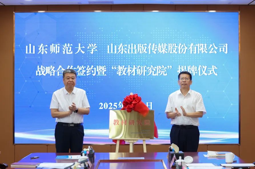 申维龙、许双庆代表双方签署战略合作协议。股份公司、山东师范大学有关负责人为“教材研究院”揭牌。
