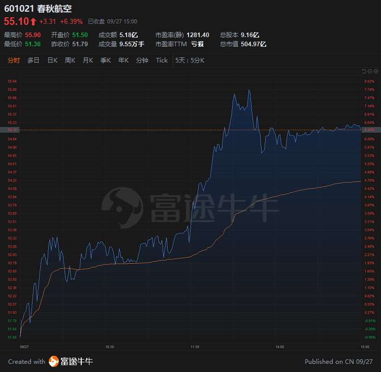 9月27日收盘,整个航空机场板块拉升,春秋航空涨6.39%报55.10元。