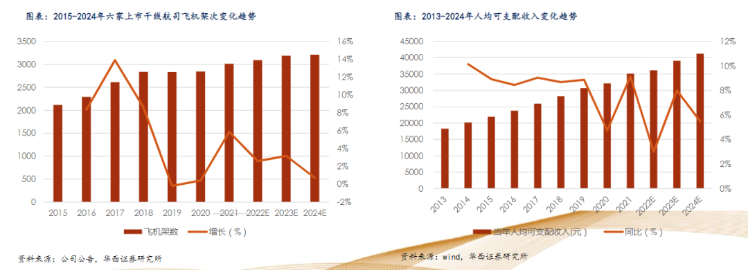 从行业未来3年的飞机引进计划来看,2018-2024年,飞机架数年复合增速只有2.1%,但同期2022-2024年人均可支配收入的预计增速分别为3%、8%、5.5%,假设2018-2024年航空出行需求内生增速与同期6.5%的人均可支配收入增速基本持平,很明显未来将出现供需不平衡的局面。