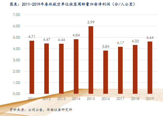 剔除疫情的特殊时期,从长周期角度,航空客运的单位旅客周转量是促进公司归母净利润提升的稳定支撑。2011-2019年春秋旅客周转量稳定增量提升,复合增速为18.4%。