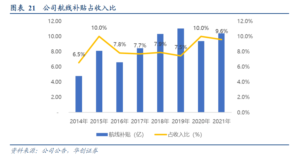 2021年,春秋毛利率-4.35%,净利率0.34%,这种违背经济学的现象其实就是补贴的功劳。同年,春秋航线补贴10.4亿元,财政补贴2.9亿元,这笔钱就成为了当年业绩的“润滑剂”,公司实现扭亏为盈,成为上市航司中的唯一存在。