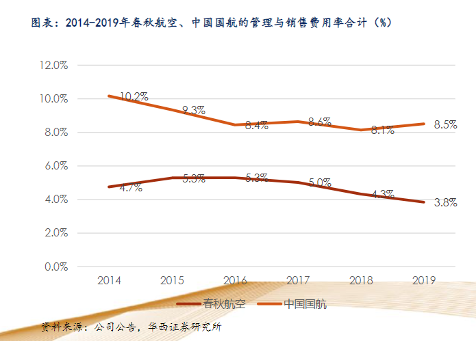 “两低”是针对销售和管理费用。春秋从创立之初就研发了自己的IT系统,以电子商务直销为主要销售渠道,不需要通过中航信来分销,光是这笔系统使用费就省了上亿元。低管理费用得益于公司业务和财务ERP一体化,有效降低了人力成本和日常费用。对比中国国航,春秋这两项费用低的可不是一星半点。