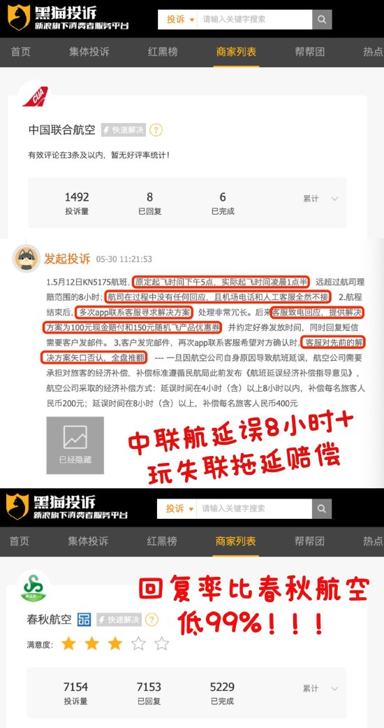 近期,有消费者通过黑猫投诉【投诉入口】平台反馈,自己购买的中联航航班原定下午5点起飞,实际凌晨1点半才起飞,延误8个多小时,当时航司完全失联,机场电话和人工客服都联系不上。自己多次联系客服寻求解决方案,得到解决方案为赔付100元现金和150元随机飞产品优惠券,然而在邮件确认过程中客服却对先前的解决方案矢口否认全盘推翻。截至目前,中国联合航空在黑猫投诉平台投诉累计达1492单,回复率几乎为0,比春秋航空回复率低99%以上。