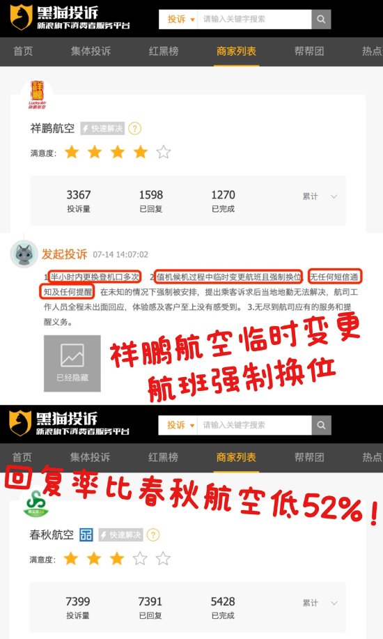近期,有消费者通过黑猫投诉【投诉入口】平台反馈,祥鹏航空半小时内多次更换登机口,值机候机过程中临时变更航班且强制换位,无任何短信通知及提醒。截至目前,祥鹏航空在黑猫投诉平台投诉累计达3367单,回复率不足50%,比春秋航空回复率低52%。