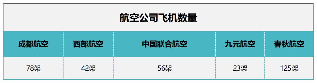 据略大参考从下述五家航司的官网截至7月的数据统计,以下航司中,即使是数量最高的成都航空也仅有78架飞机,约为春秋航空的6成,而九元航空的飞机数量几乎只有春秋航空的零头。