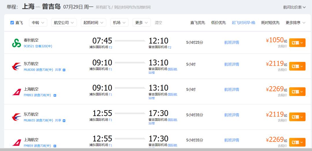比如上海飞普吉岛的热门航线中,多家航司都需要中转,中转时间短则两三小时,长则二十个小时。而在5个直飞、且能够在18点前落地的航班中,只有春秋航空一家廉航,含税1000元左右的票价,相比其他航司只有一半左右。