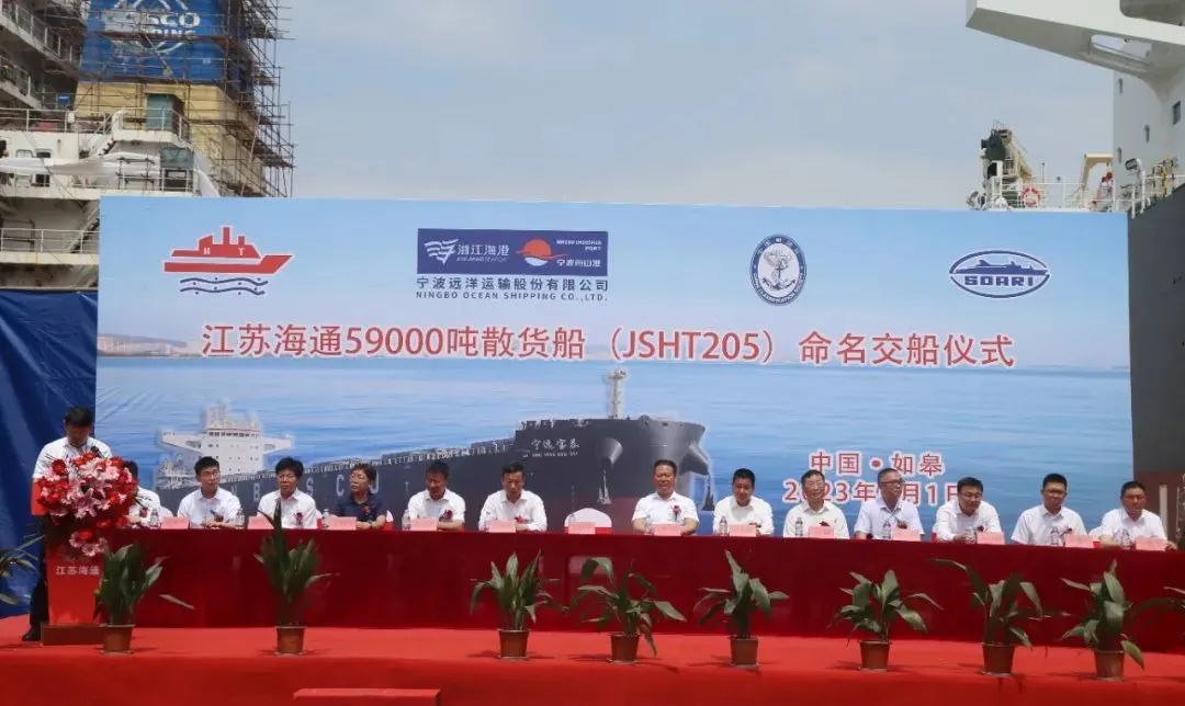 教母丁园芳女士,宁波舟山港股份有限公司党委委员、副总经理丁送平先生,宁波远洋运输股份有限公司总经理、党委副书记陈晓峰先生,宁波远洋运输股份有限公司党委委员、副总经理陈加挺先生,中国船级社南通办事处副主任罗奕鑫先生,上海船舶研究设计院党委书记王麟先生,上海双希海事发展有限公司副总经理凌诒灏先生以及我公司董事长/总经理金星先生,副总经理王鹤飞先生,副总经理钱志东先生等领导和嘉宾共同出席了上述仪式。