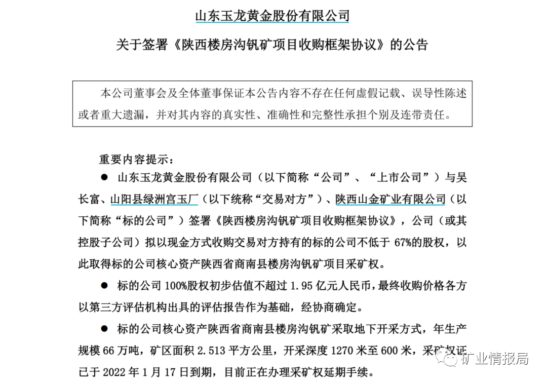 10月13日晚间,玉龙股份发布公告称,公司与吴长富、山阳县绿洲宫玉厂、陕西山金矿业有限公司签署《陕西楼房沟钒矿项目收购框架协议》,公司(或其控股子公司)拟以现金方式收购交易对方持有的标的公司不低于67%的股权,以此取得标的公司核心资产陕西省商南县楼房矿项目采矿权。