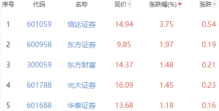 其中,信达证券、东方证券、东方财富、光大证券和华泰证券位列板块涨幅前五位,涨幅分别为3.75%、1.97%、1.48%、1.45%和1.18%。