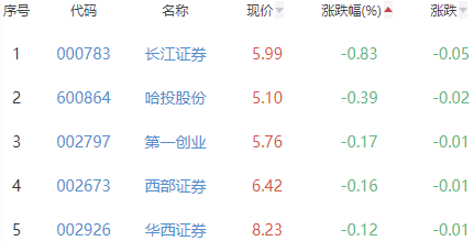 长江证券、哈投股份、第一创业、西部证券和华西证券位列涨幅榜后五位,涨幅分别为-0.83%、-0.39%、-0.17%、-0.16%和-0.12%。