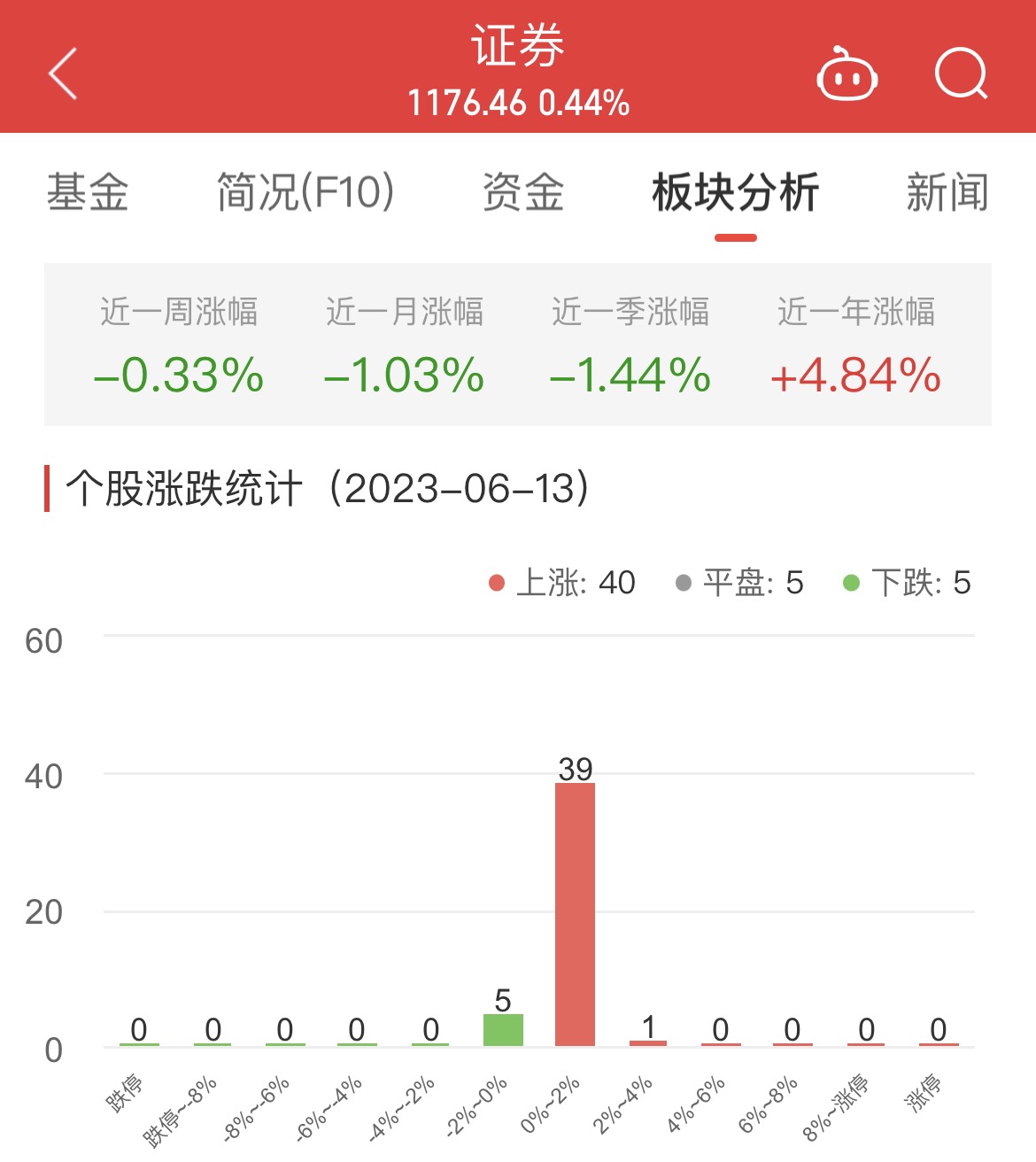 中国经济网北京6月13日讯今日,证券板块整体涨幅0.44%,其中40只股票上涨,5只股票平盘,5只股票下跌。