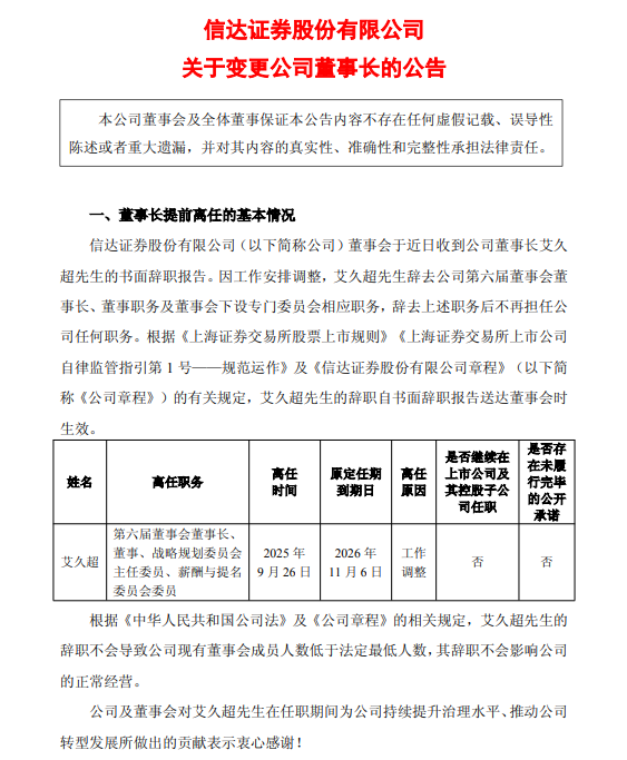 艾久超的卸任并非毫无征兆。今年8月在信达证券召开的临时股东大会上,补选了林志忠、张毅为公司第六届董事会非独立董事。一个月左右时间,林志忠接棒董事长一职。