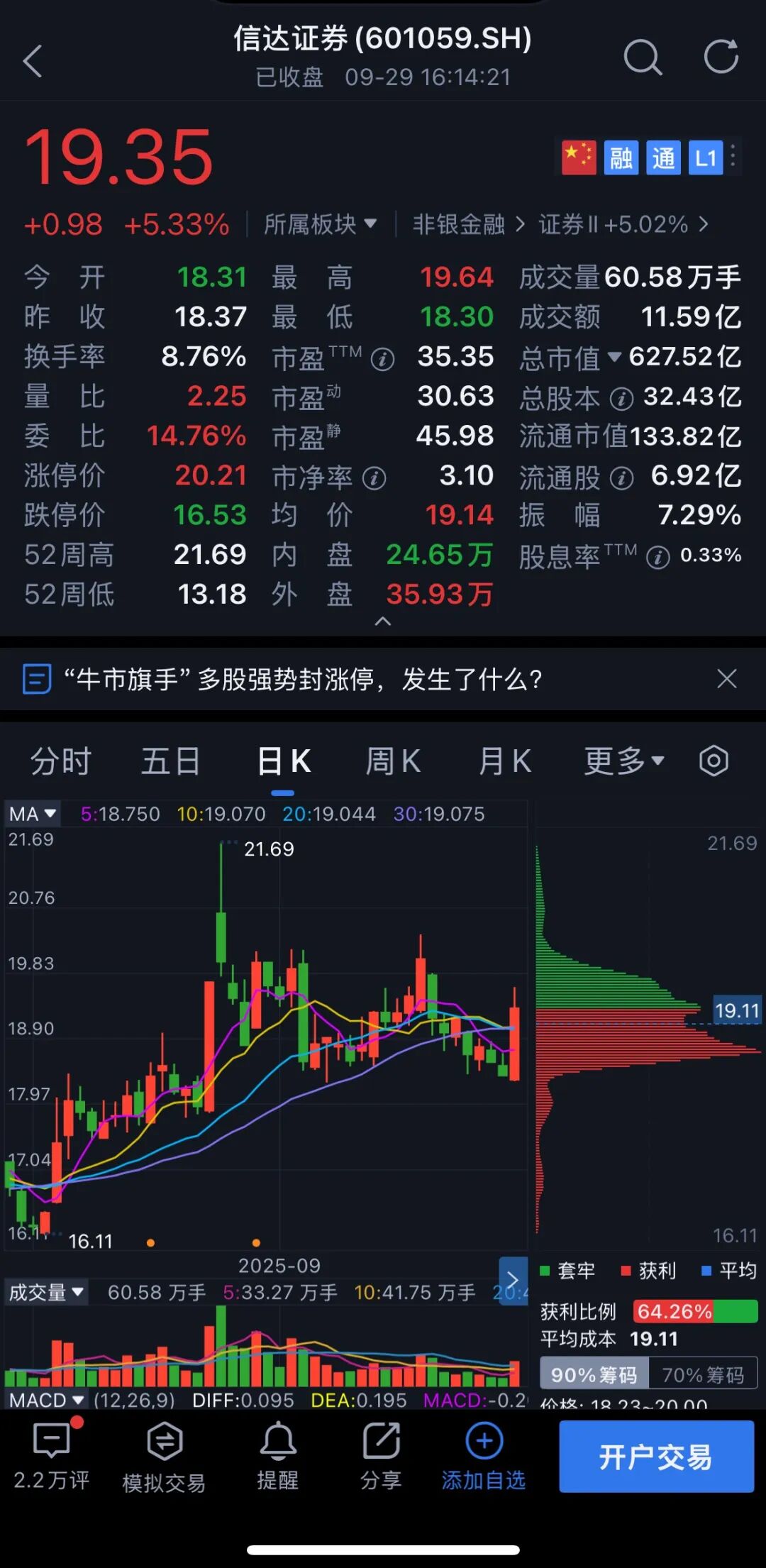二是信达证券于2023年2月1日成功在上交所主板挂牌上市,跻身上市券商之列。该股发行价8.25元/股,上市首日开盘价13.07元。截至2025年9月29日,该股收报19.35元/股,较上市当日上涨48%,最新市值627.52亿元。