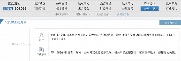 比如江盐集团在互动平台上有表示,公司的产品销往韩国、马来西亚等地,是中国南方区域盐产品的主力供应商。