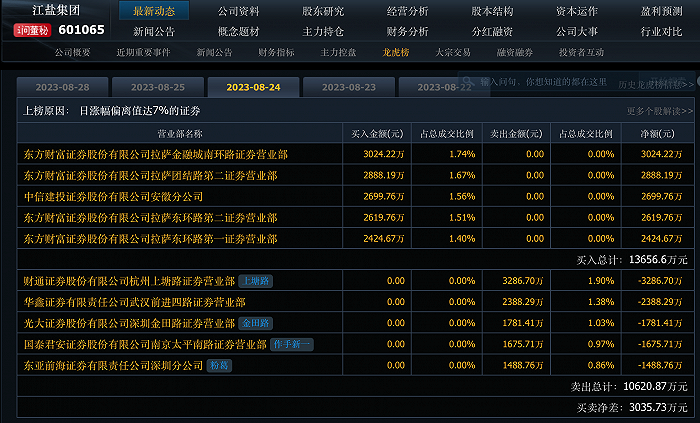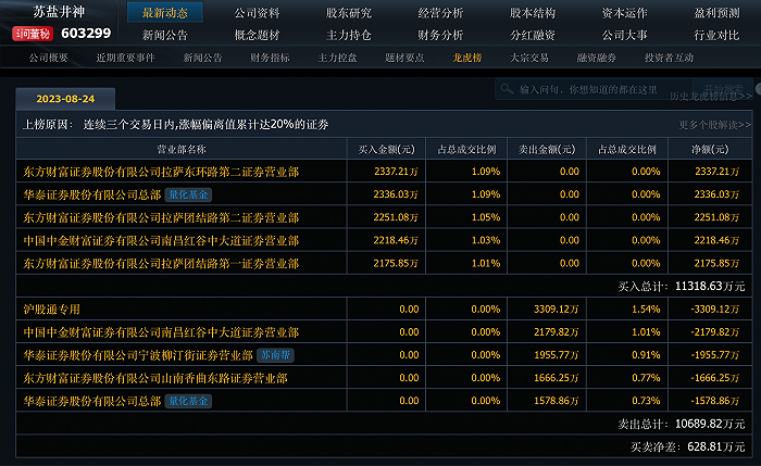 从苏盐井神的8月24日龙虎榜也可以看到,连续三个交易日里,买入最多的是东方财富证券拉萨东环路第二营业部,金额为2337.21万元,另如东方财富证券拉萨团结路第二营业部、拉萨团结路第一营业部都有上榜。