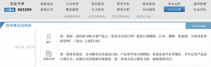 苏盐井神在互动平台上表示,公司产品出口到韩国、东南亚及中东等地区,今年已有产品出口到日本。