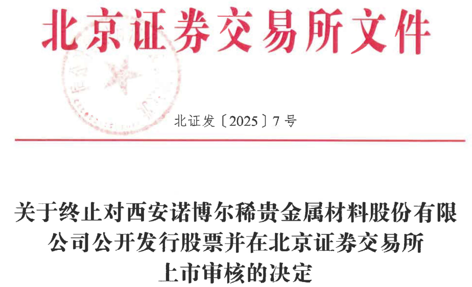 北交所网站昨晚披露关于终止对西安诺博尔稀贵金属材料股份有限公司(简称“西诺稀贵”)公开发行股票并在北京证券交易所上市审核的决定。