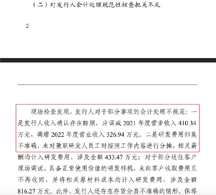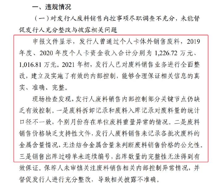 1 、现在调查严格或者说太严格了。根据这个处罚书,无非就是二个问题,第一是废料销售相关内部控制整改不充分,部分关键节点仍缺乏有效控制,相关信息披露不准确申报文件显示,发行人曾通过个人卡体外销售废料,2019年度、2020 年度个人卡资金收入合计分别为1,226.72万元、1,016.81 万元。2021 年初,发行人已对废料销售业务进行全面整改,建立及实施了有效的内部控制,能够合理保证相关信息的真实、准确、完整。现场检查发现,发行人废料销售内部控制部分关键节点仍缺乏有效控制。第二是部分事项会计处理不规范,导致相关信息披露不准确现场检查发现,发行人对于部分事项的会计处理不规范,导致相关财务数据披露不准确:一是发行人收入确认存在跨期,应调减 2021 年度营业收入 410.34 万元,调增2022 年度营业收入326.94 万元。