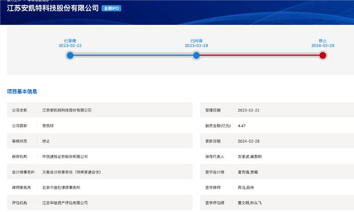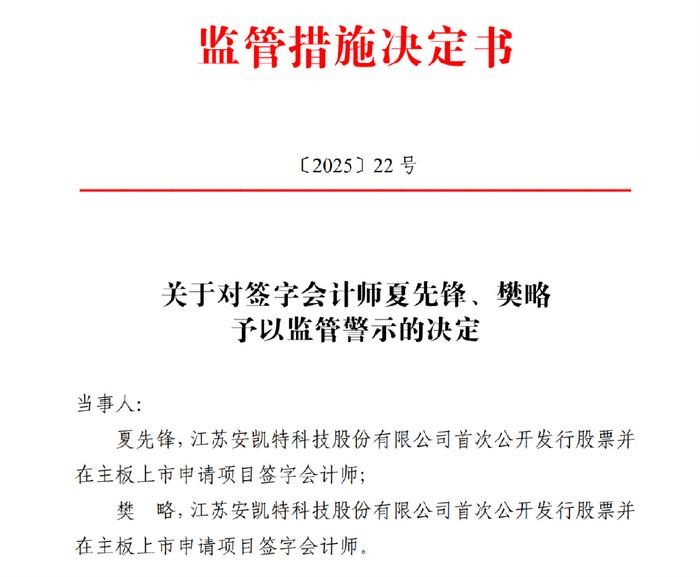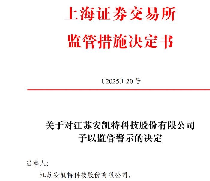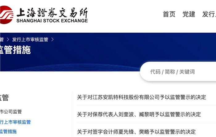 上交所网站显示,江苏安凯特、保荐人刘奎波和臧黎明、签字会计师夏先锋樊略给监管警示。