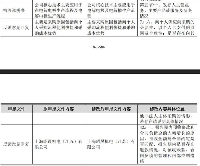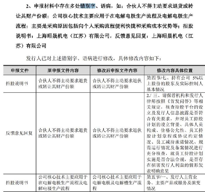 如合伙人不得主动要求退货或转让其财产份额、公司核心技术主要应用于在电解电极生产流程及电解电极生产流程、主要是采购原因包括向个人采购流程便利快捷和采购成本优势等、招股说明书上表述为“上海昭晟机电(江苏)有限公司”,但在反馈意见回复中却显示为“上海昭晨机电(江苏)有限公司”等多处错误。