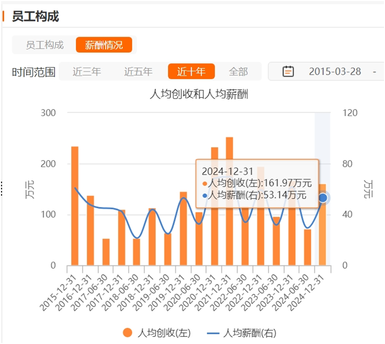 从人员变动数据来看,截至2024年末,中信建投的员工总数为13045人,相较于2023年的13901人,减少了856人,减员比例达到6.16%。同时,员工人均薪酬也有所降低,整体人力成本的下降对营业支出减少起到了推动作用。