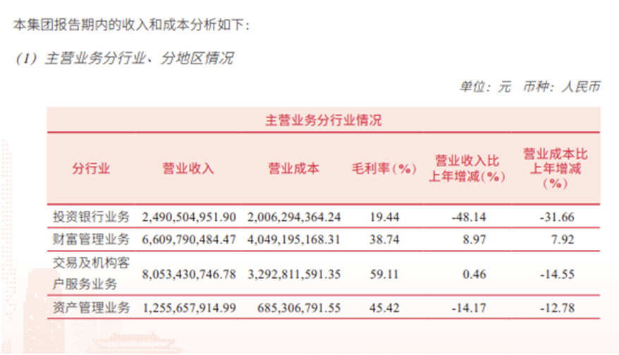 在此次报告期内,中信建投呈现出复杂的经营态势,增利不增收。从具体业务板块分析,各板块业绩分化明显。投资银行业务板块收入为24.91亿元,遭遇“滑铁卢”,同比降幅高达48.14%;财富管理业务板块则展现出强劲增长势头,营业收入攀升至66.10亿元,实现了8.97%的同比增幅;交易及机构客户服务业务板块稳步前行,实现营业收入80.53亿元,虽然增幅仅0.46%,但在整体营收中占比较大;资产管理业务板块收入为12.56亿元,同比下降14.17%。