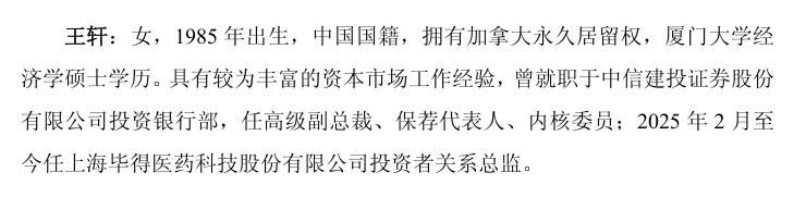 履历资料显示,王轩曾就职于中信建投投资银行部,任高级副总裁、保荐代表人、内核委员;2025年2月至今任毕得医药投资者关系总监。