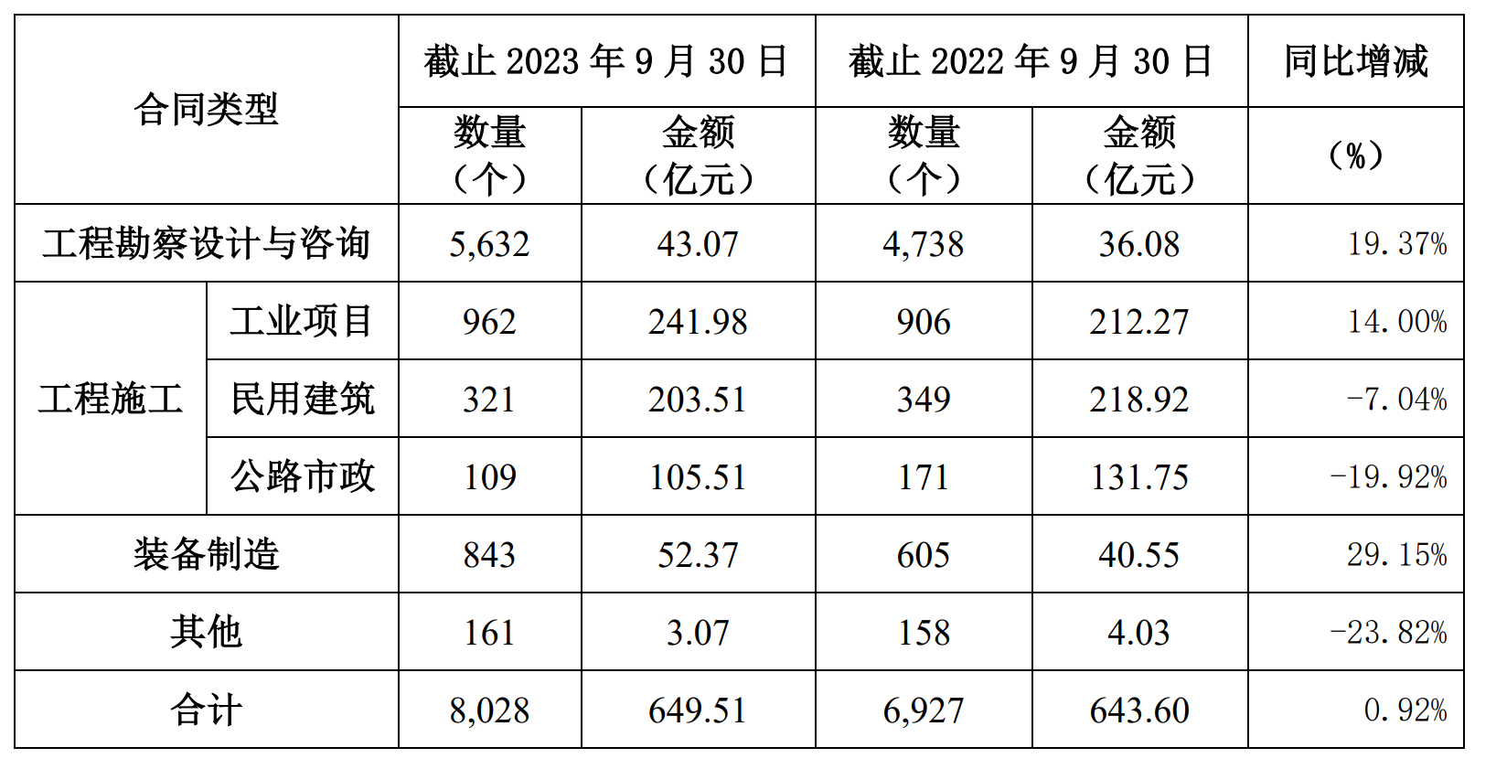 截至2023年9月30日,公司未完工合同总额为人民币649.51亿元。
