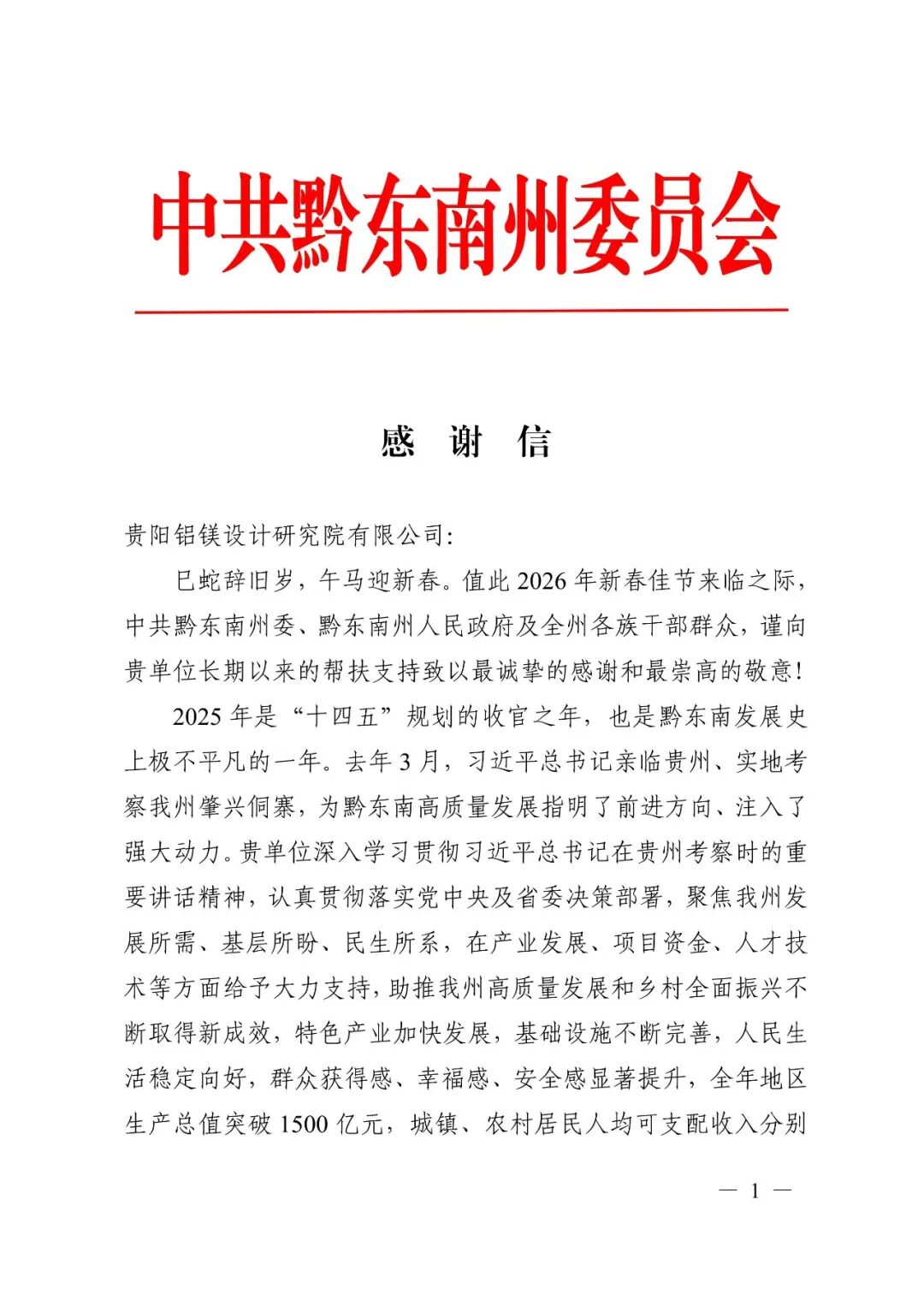 近日,中共黔东南州委、黔东南州人民政府向贵阳院发来感谢信,对中铝国际贵阳院长期以来扎根黔东南、助力地方高质量发展和乡村全面振兴的倾力帮扶致以诚挚感谢与崇高敬意,彰显了央企践行社会责任的使命担当。