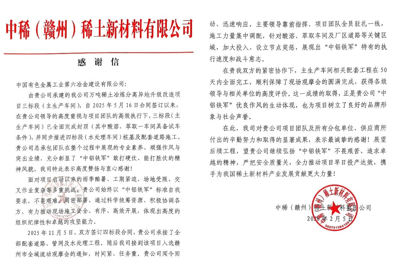 近日,中稀(赣州)稀土新材料有限公司向中铝国际六冶发来感谢信,对六冶承建的万吨稀土冶炼分离异地升级改造项目三、四标段建设成果给予高度肯定,赞誉六冶项目建设团队敢打硬仗、能打胜仗的优良作风。