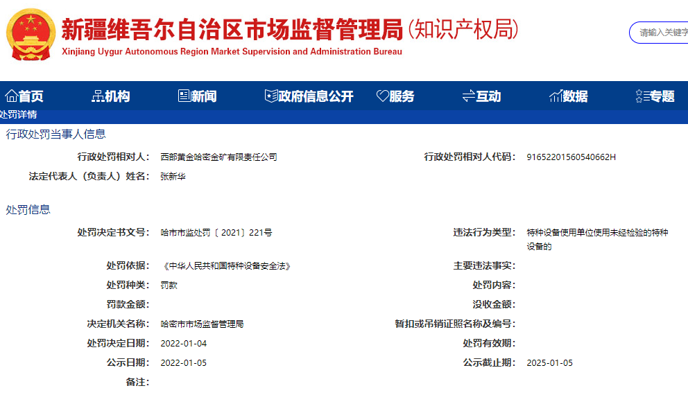 1月10日讯新疆维吾尔自治区市场监督管理局网站近日公布的处罚决定书(哈市市监处罚〔2021〕221号)显示,西部黄金哈密金矿有限责任公司因存在特种设备使用单位使用未经检验的特种设备的违法行为,被哈密市市场监督管理局处以罚款。处罚依据为《中华人民共和国特种设备安全法》。
