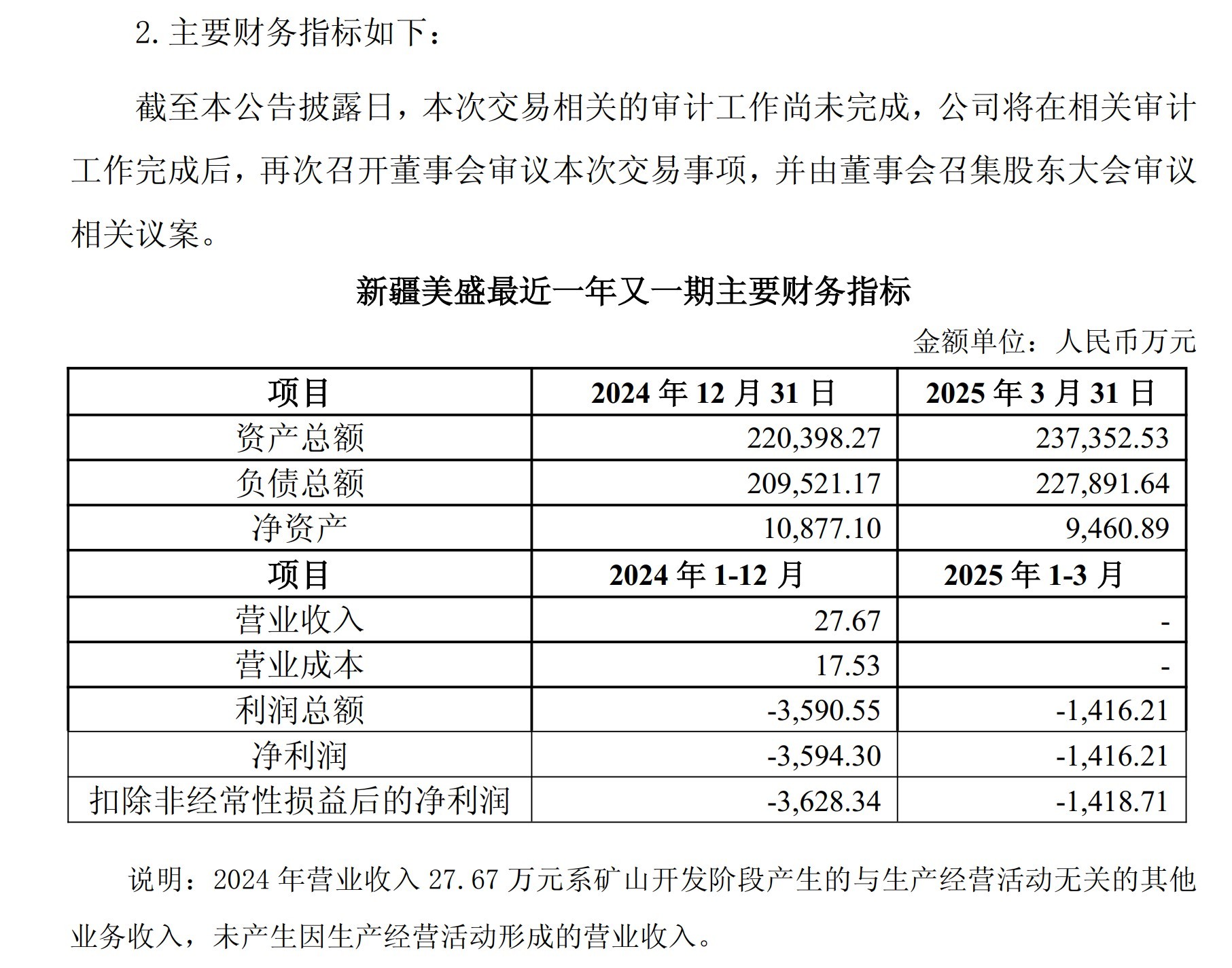 “现新疆美盛预计2025年下半年投产,新疆有色为履行其前期作出的承诺,妥善解决潜在的同业竞争问题,同时西部黄金看好该矿山项目的发展前景,双方同意西部黄金以现金方式收购新疆有色持有的新疆美盛100%的股权。”西部黄金表示。