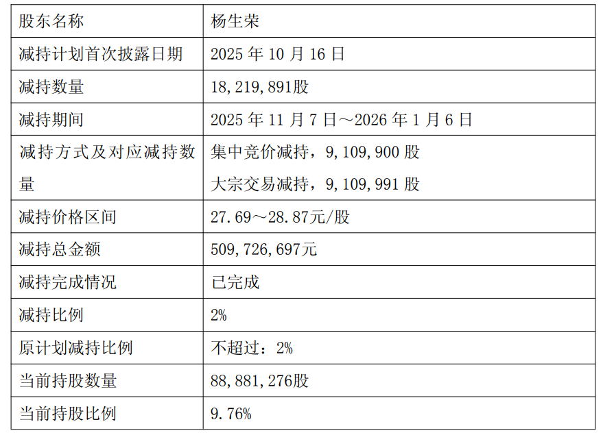 减持计划实施完毕后,杨生荣持有公司股份88,881,276股,占公司总股本的9.76%。