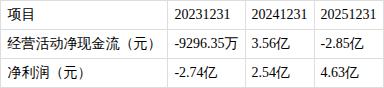 ?净利润与经营活动净现金流背离。报告期内,净利润为4.6亿元、经营活动净现金流为-2.8亿元,净利润与经营活动净现金流背离。