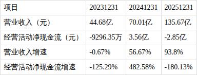 报告期内,公司营收为135.67亿元,同比增长93.8%;净利润为4.63亿元,同比增长82.46%;经营活动净现金流为-2.85亿元,同比下降180.13%。