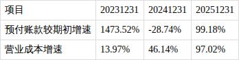 ?预付账款增速高于营业成本增速。报告期内,预付账款较期初增长99.18%,营业成本同比增长97.02%,预付账款增速高于营业成本增速。