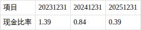 ?现金比率持续下降。近三期年报,现金比率分别为1.39、0.84、0.39,持续下降。