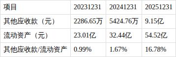 ?其他应收款/流动资产比值持续增长。近三期年报,其他应收款/流动资产比值分别为0.99%、1.67%、16.78%,持续上涨。