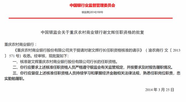 公开资料显示,谢文辉出生于1972年,理工科出生。1997年硕士毕业的他进入了中国工商银行珠海软件开发中心工作,不到一年便升任工行重庆的科技处副科长。2007年,谢文辉被聘为重庆市农村信用社联合社科技处总经理助理、副总经理,几年后又被提拔为重庆农商行的科技部总经理,时年35岁。高超的技术和过人的领导能力使得谢文辉在众多竞争者中脱颖而出,2014年3月,其行长的任职资格获得核准。截至今年6月末,这已是他任职的第七个年头。