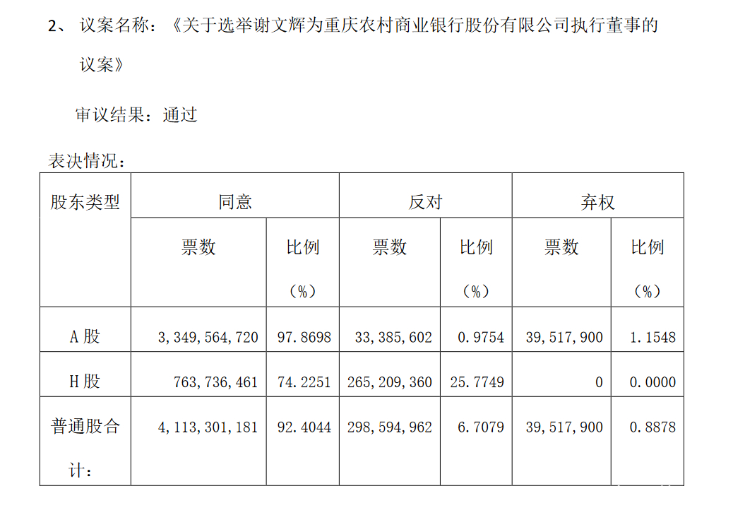 值得一提的是,在审议《选举谢文辉为重庆农商行执行董事的议案》时,反对谢文辉为执行董事的H股票数超过1/4。虽然出席会议的境外上市外资股股东仅持有10.29亿H股股份,但来自香港的投资者还是通过选票的方式表明了自己的态度。